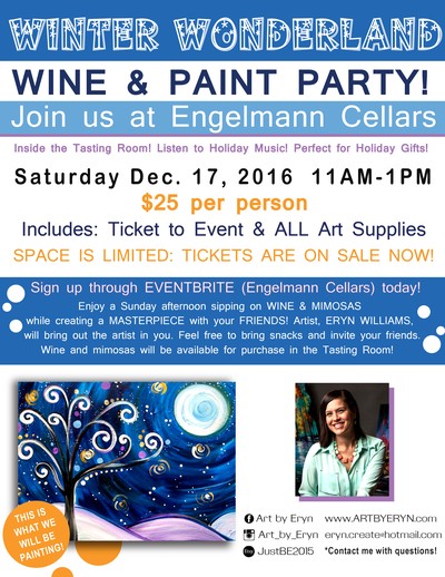Includes: Ticket to Event & ALL Art Supplies SPACE IS LIMITED: TICKETS ARE ON SALE NOW! Sign up through EVENTBRITE (Engelmann Cellars) today!